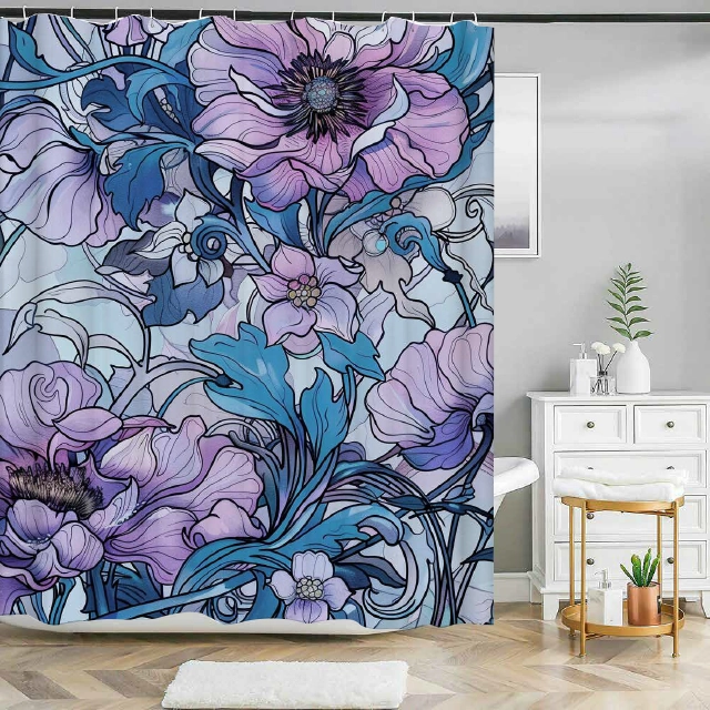 Dette billede viser et detaljerigt og kunstnerisk badeforhæng, der tilfører et iøjnefaldende element til badeværelset. Badeforhænget er domineret af et stort, livligt blomstermotiv i nuancer af lilla, pink, blå og sort. Blomsterne, i forskellige stadier af udfoldelse, spænder fra fuldt åbne til knap spirer og er indrammet af elegante, mørkeblå stilke og blade. Disse elementer er tegnet med en næsten grafisk præcision, hvor konturerne i sort skiller sig tydeligt ud mod den blå og grå baggrund, skabende en følelse af dybde og bevægelse. Materialet i badeforhænget ser ud til at være af en robust, høj kvalitet, som effektivt kan modsætte sig vand og damp, typisk for badeforhæng designet til at vare længe. Teksturen, selvom den ikke er synlig i detaljer, ser glat ud, hvilket bidrager til et rent og poleret udtryk. Farvevalget, med de kølige blå og varme lilla toner, tilfører en følelse af ro og elegance til rummet, samtidig med at det fungerer som en markant kontrast til det hvide interiør i resten af badeværelset. Dette badeforhæng er ikke blot en praktisk tilføjelse til badeværelset, men også en væsentlig æstetisk komponent, der markerer stilelementerne i rummet. Det samlede indtryk er, at dette badeforhæng er både funktionelt og flot, ideelt for dem, der ønsker at kombinere praktisk anvendelighed med kunstnerisk flair i deres badeværelsesindretning.