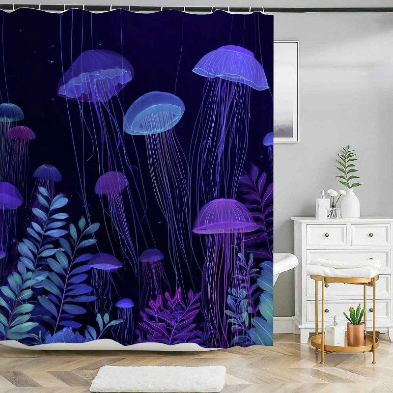 Dette billede viser et iøjnefaldende badeforhæng med et dybhavstema, fyldt med en række fluorescerende og farverige gopler svævende i en mørk, mystisk undervandsverden. Badeforhængets baggrund er dybblå og sort, hvilket simulerer den dybe del af havet. Overalt på badeforhænget ses en række gopler, der varierer i størrelse, form og farve, hvilket skaber en livlig og dynamisk atmosfære. Goplerne er detaljeret illustreret med finurlige og lange tentakler, der sirligt strømmer ned mod badeforhængets bund. Farverne på disse fascinerende havdyr varierer fra lyseblå til indigo, pink og lilla med en bioluminescerende effekt, der gør dem til at synes at gløde mod den mørke baggrund. Denne effekt forstærkes af små, lysende prikker, der ligner flydende plankton eller små havpartikler, spredt tilfældigt over hele badeforhænget. Materialet i badeforhænget ser ud til at være af en kraftig kvalitet, sandsynligvis polyester, som er ideelt til både at modstå vand og at bevare de levende farver i printet. Forhænget er ophængt på en standard badeforhængsstang ved hjælp af diskrete ringe, som tillader let åbning og lukning. Samlet set er dette badeforhæng ikke bare en praktisk tilføjelse til et badeværelse, men også en dekorativ erklæring, der tilfører et unikt og kunstnerisk touch til rummet. Den omhyggelige detaljegrad og de dristige farver på badeforhænget gør det til en iøjnefaldende og charmerende del af badeværelsesindretningen.