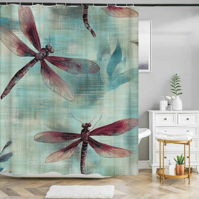 Dette badeforhæng fremstår med et iøjnefaldende og kunstnerisk motiv, der domineres af store, detaljerede gengivelser af guldsmede. Baggrunden af badeforhænget har en akvarelagtig effekt i rolige blå og grønne nuancer, som tilføjer en følelse af ro og harmoni til designet. Overfladen synes at simulere en let tekstur, der minder om lærred, hvilket tilfører en ekstra dimension til det visuelle udtryk. Guldsmedene er tegnet med imponerende detaljerigdom – fra de fint aftegnede vinger med deres tydelige årer til de nuancerede, mørkerøde og brunlige farvetoner, der skaber et naturtro udseende. Hver guldsmed er unikt placeret, og sammen skaber de en dynamisk og næsten livagtig effekt på badeforhænget. Badeforhængets farvepalet er både beroligende og elegant, hvilket gør det velegnet til mange forskellige badeværelsesstilarter, fra det moderne til det mere klassiske. Materialet ser ud til at være af en type, der er velegnet til badeværelset, muligvis polyester eller en anden form for vandafvisende stof, der gør det praktisk samt let at vedligeholde. Samlet set er dette badeforhæng ikke bare en funktionel genstand, men også en markant og smuk dekoration, der kan transformere et badeværelse og tilføre det en kunstnerisk og personlig touch.