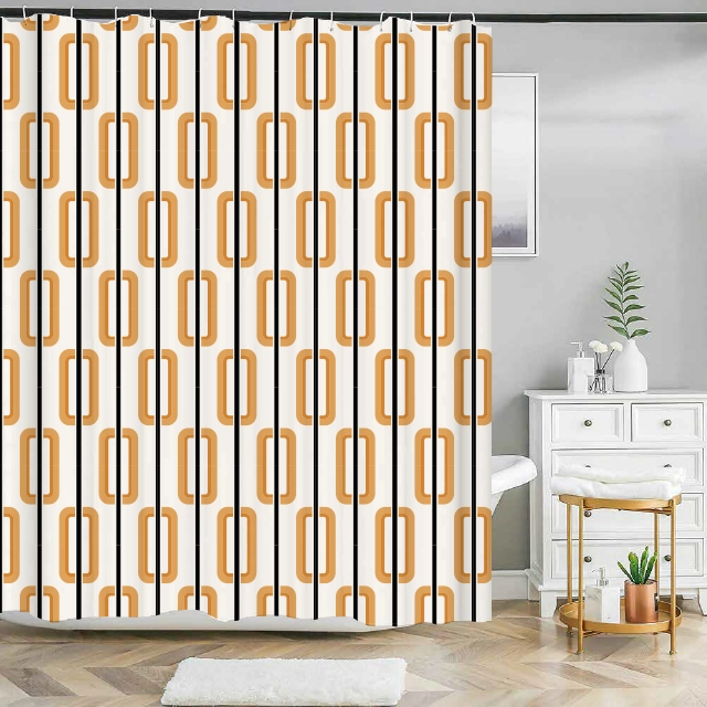 De gentagne former giver mønsteret en elegant rytme, mens de varme karameltoner skaber en indbydende stemning. Resultatet er et badeforhæng, der både virker dekorativt og moderne.