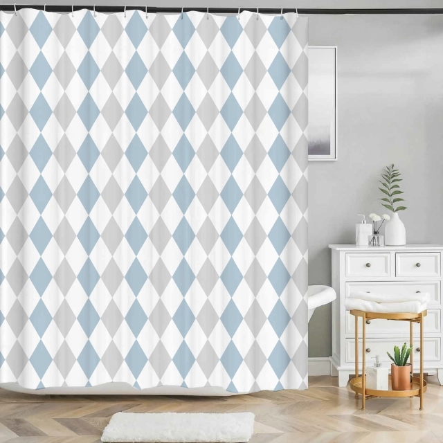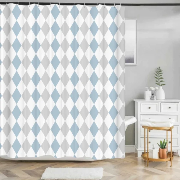Dette badeforhæng med harlekin mønster er et stilrent og elegant valg til badeværelset. De gentagne romber i lyseblå, grå og hvid skaber et harmonisk og roligt udtryk.