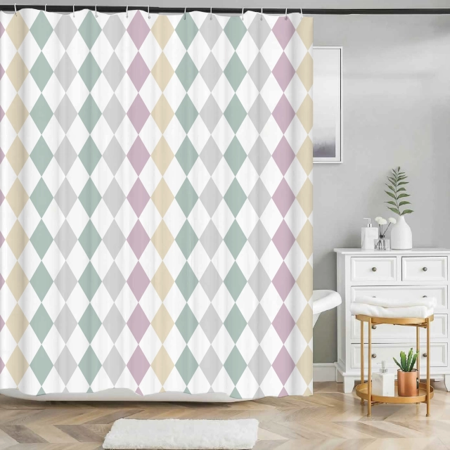 Dette badeforhæng med harlekin mønster er et elegant og roligt valg til badeværelset. De gentagne romber i pastel grøn, rosa, beige og grå skaber et harmonisk og stilrent udtryk.