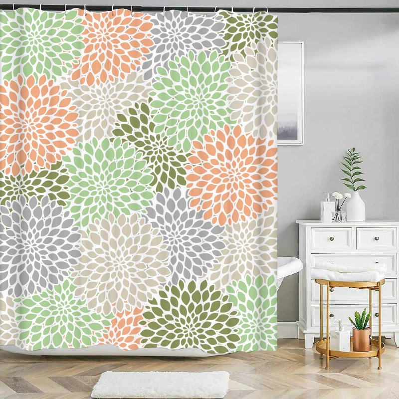 Motivet på dette badeforhæng består af et gentagende mønster af store dahlia-blomster set oppefra. Hver blomst er opbygget af mange aflange, blødt afrundede kronblade, som ligger tæt og danner cirkulære, symmetriske former. Blomsterne overlapper hinanden let og skaber en sammenhængende flade med en rolig rytme. Farvepaletten er afdæmpet og naturlig med nuancer af beige, sand, varm grå, blød grøn og dæmpet orange. De lyse jordfarver giver motivet et varmt og harmonisk udtryk, mens de grønne toner tilfører friskhed og balance. De orange elementer skaber blide kontraster, som giver liv uden at virke dominerende. Baggrunden er lys og neutral, hvilket fremhæver blomsterformer og farver på en elegant måde. Stilen er grafisk og moderne, men samtidig inspireret af naturens organiske former. Det samlede udtryk er roligt, afbalanceret og behageligt for øjet, med en sanselig kvalitet der gør motivet velegnet til et afslappende badeværelsesmiljø.